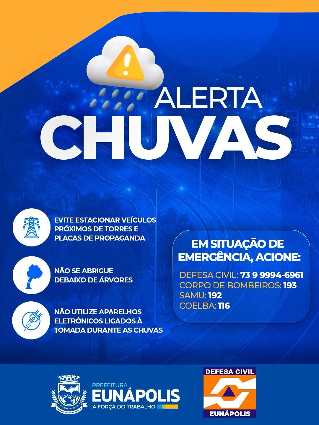 Defesa Civil deEunápolis emite alerta para chuvas