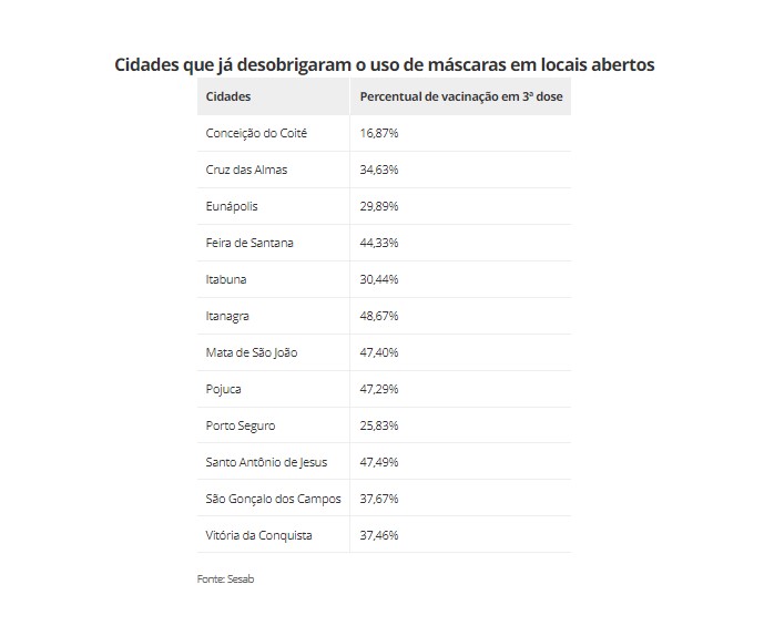 Até esta quarta-feira (30), ao menos 11 cidades da Bahia já desobrigaram uso de máscaras em espaços abertos. No entanto, estes mesmos municípios não alcançaram 50% de vacinados com a dose de reforço da Covid-19.