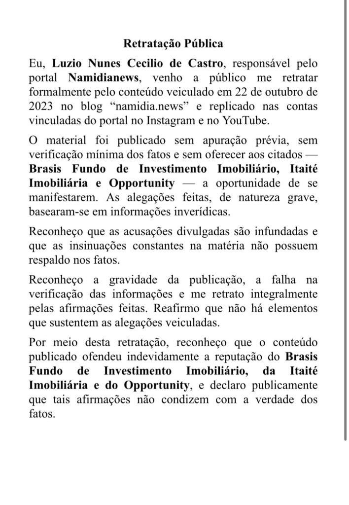 Portal NamidiaNews publica retratação formal após divulgar informações inverídicas sobre o Brasis Fundo de Investimento Imobiliário, Itaité Imobiliária e Opportunity.