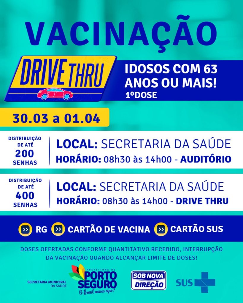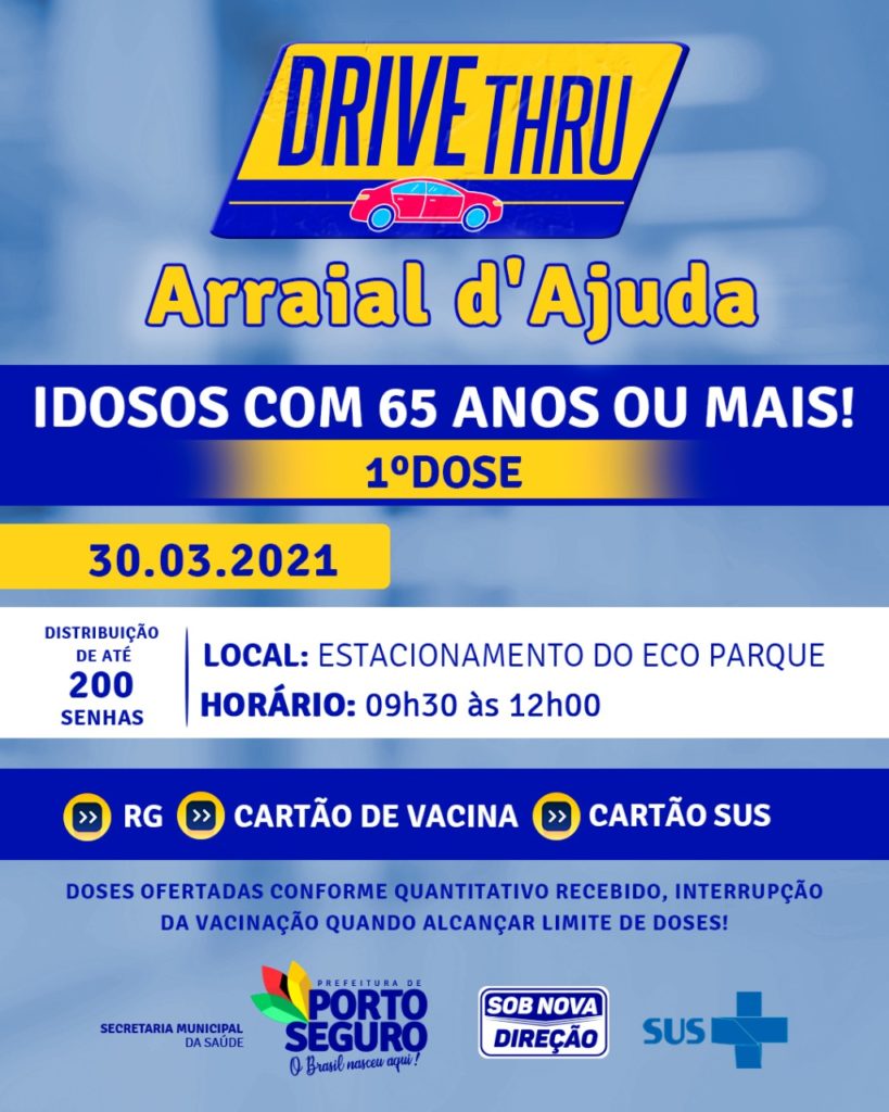 Em Arraial d’ Ajuda, o drive thru será realizado no estacionamento do Eco Parque, onde 200 fichas serão distribuídas a partir das 09h30 da manhã. As doses também serão ofertadas nas Unidades de saúde de alguns bairros, conforme cronograma divulgado nas redes sociais da Prefeitura.