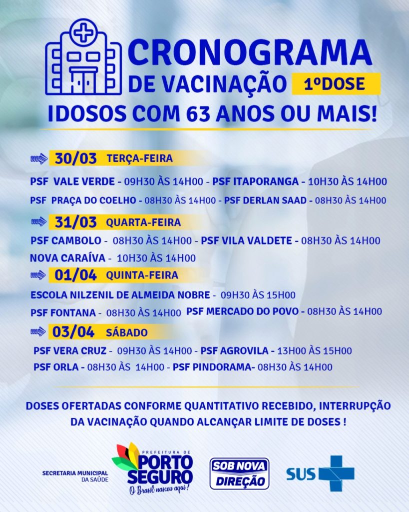 Nesta segunda-feira (29), a Prefeitura de Porto Seguro divulgou que dará início amanhã, terça-feira (30), à vacinação de idosos de 63 anos ou mais contra a Covid-19.